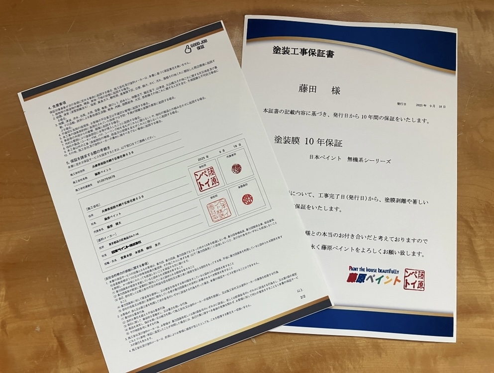 対象部位・使用塗料・保証年数を明記した保証書を完工時にお渡しします(工程記録とセット)。
