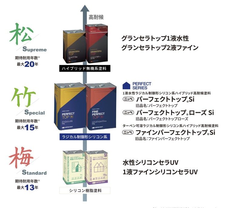 - ミドル(ラジカル系):パーフェクトトップSi(耐候13〜15年)
