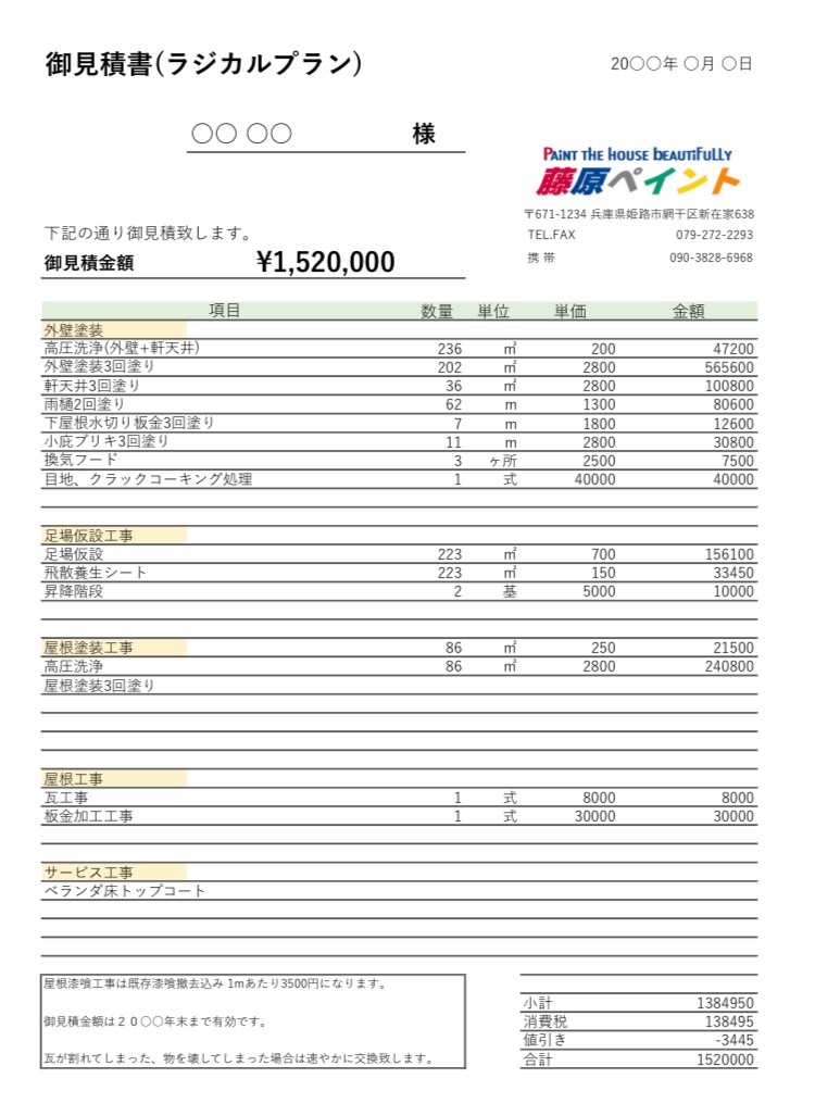 大幅値引きには注意が必要で、最初の上乗せや工程・材料の削減で帳尻を合わせるケースがあります。適正価格は面積と単価、工程、使用材料の内訳で判断できます。藤原ペイントは過度な値引きではなく、内容と品質で納得できる見積りを出します。