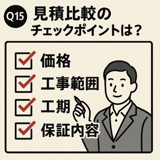 相見積もりは2〜3社で十分です。比較するのは金額だけでなく、範囲・数量・塗料名・工程数・下地処理・保証内容まで揃えること。根拠を説明できる会社ほど、施工後の安心につながります。